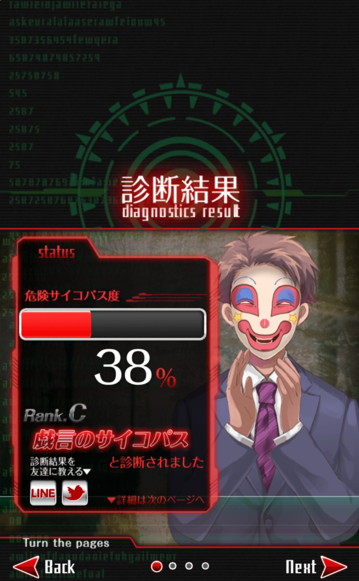 著者撮影診断30問にすべて答えると、いよいよ診断結果が表示されます。このゲームアプリの診断では、「貴方がサイコパスなのかyes/no」で診断されるわけではなく、「貴方はどんなサイコパスなのか」という診断をしてくれます。このゲームアプリをプレイする前まではでっきり、サイコパスなのかどうか。を診断されるものだと思い込んでいましたが、診断する人すべてが「サイコパス」と診断され、サイコパスであったらどんなサイコパスなのか、と診断されます。著者は「戯言のサイコパス」と診断されました。中二病のような称号を頂いてしまい、思わず笑ってしまいました。これは面白い!危険度も%で表示されるのも面白いですね。