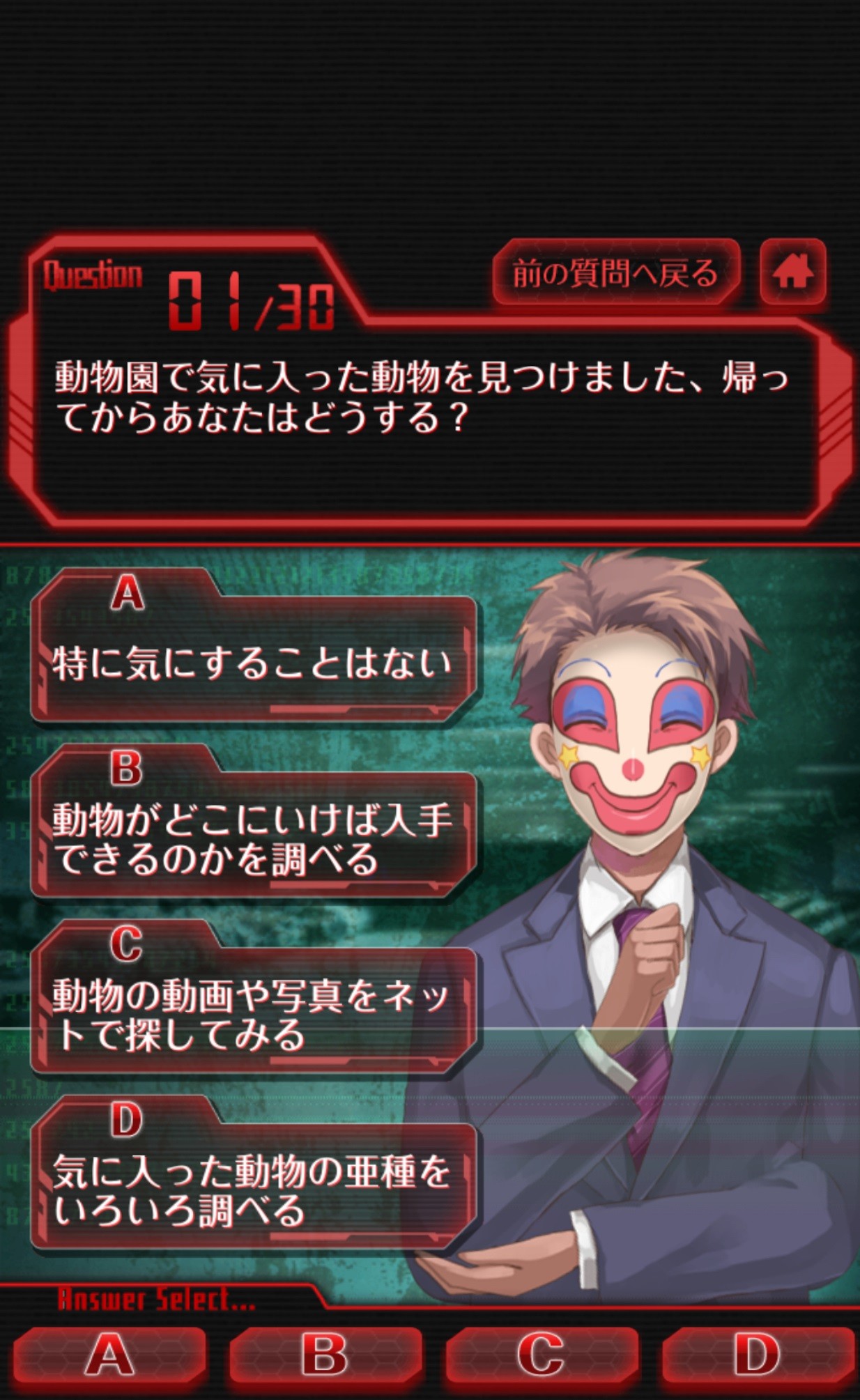 このゲームアプリを始めると、4つの選択肢が表示されます。この4つの選択肢から直感で「これだ!」と思う選択肢をタップしていきます。この診断画面の左のキャラクターは動き、診断を進めていくとまた違った動きを見せてくれます。手を口に当てたり、ニタニタ笑ったり、首を左右に振ったり…と、なんだか見透かされているようで恐怖を感じます。ですが、そんな緊張感がある状態で診断を進めていくので、適当な気持ちで選択肢を選ぶことが出来ないので、診断結果が正確なものになりやすいですね!診断の問題は全部で30問あり、ちょうどいい問題数なので飽きることもありません!