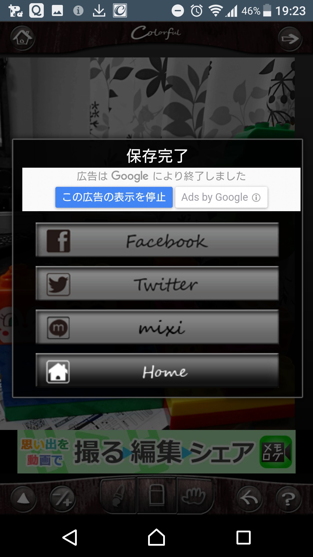 ペンマークや消しゴムマークにも丁寧に日本語で表示がでてくるので、操作に迷うことなく編集ができるようになっています。保存完了後は、Twitter、Facebookに共有することも可能です。