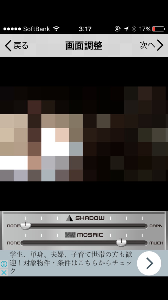 影の入り方やモザイクの大きさが、スライドバーを動かすだけで簡単に調整できます。動かしたらすぐ映像に反映されるので、見ながら調整できる点が便利です。