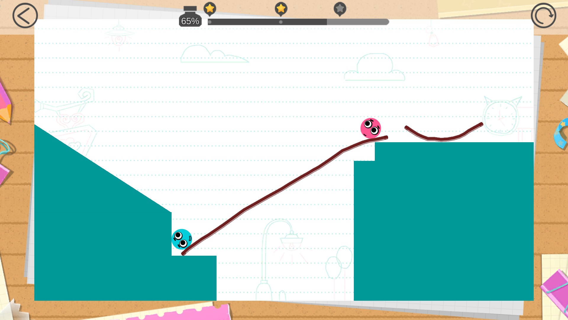 頭を使うパズルゲームで、青とピンクのボールが離れておいてあるので、二つをくっつけたらステージクリアです。くっつけるために画面をなぞり、ペンで色々な形の線を書き込みます。形は坂であったりお椀であったりとさまざまで、とにかくくっつけることができればクリアなので色々と試してみましょう。難題でも意外とクリアできるかもしれません。クリアするともらえるお金で、ボールやペンを変更できます。