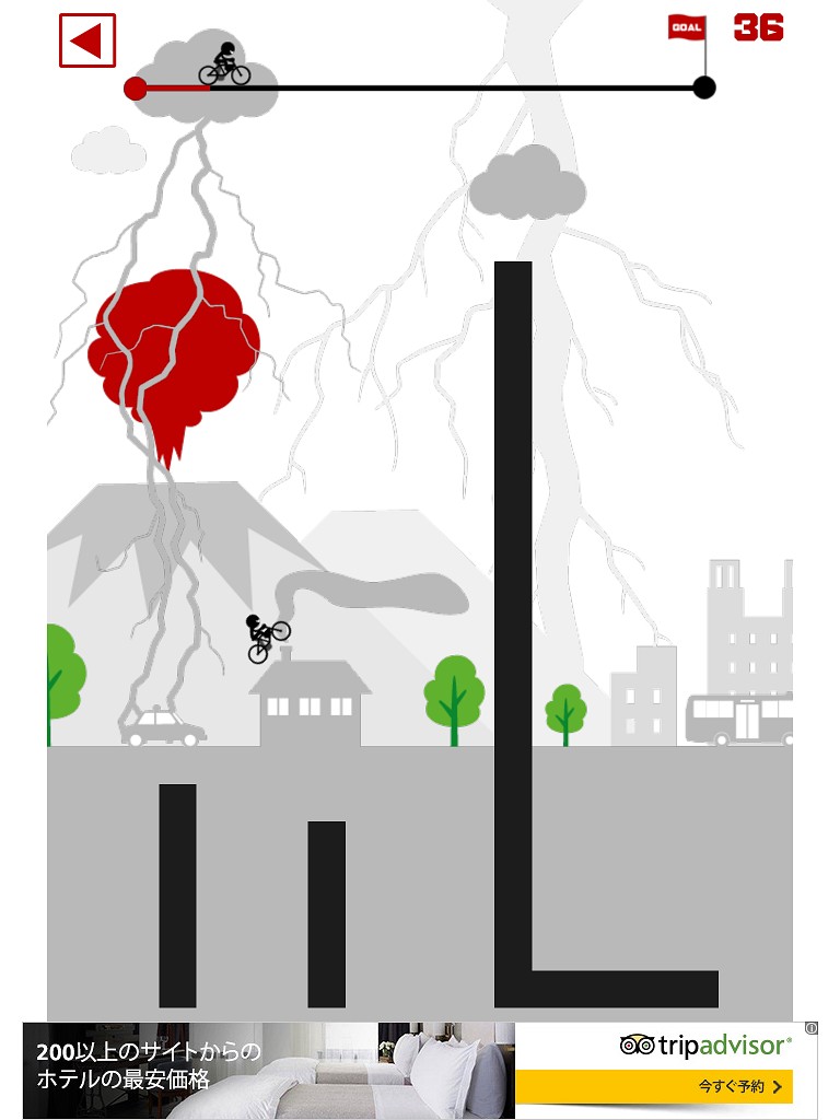 チャリを使いゴールへ辿りつくことが目的の単純なゲームアプリですが、難易度が激ムズです。最初のうちは慣れる意味でも比較的簡単ですが、段々と厳しくなってきます。四段ジャンプを上手く活用してください。100ステージをクリアすると裏のステージが登場し、さらに難易度が上がります。ステージ自体は短く、課金要素もないのでのんびり楽しみましょう。