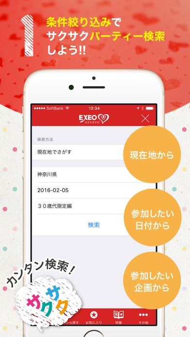 1. 「エクシオナビ - 婚活パーティー お見合いパーティー」は、日付や条件、企画からお見合いパーティーの検索可能!