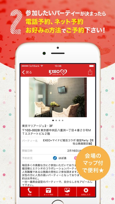 婚活の初心者の方や、事前に情報収集が苦手な方、出会いを求めるどなたにもおすすめです。実際に使用してみると分かりやすいのですが、まずは、「エクシオナビ - 婚活パーティー お見合いパーティー」で検索、予約します。当日までお気に入り登録画面からも気になる企画を比べたり、会場の雰囲気を画像で見たり、パーティーのコンセプトや料金などもアプリ内にすべて記載されているのでメモも要りません。初めて行く場所でも安心、アプリで起動した地図を頼りに会場へ赴き、あとはパーティーを楽しむだけです!