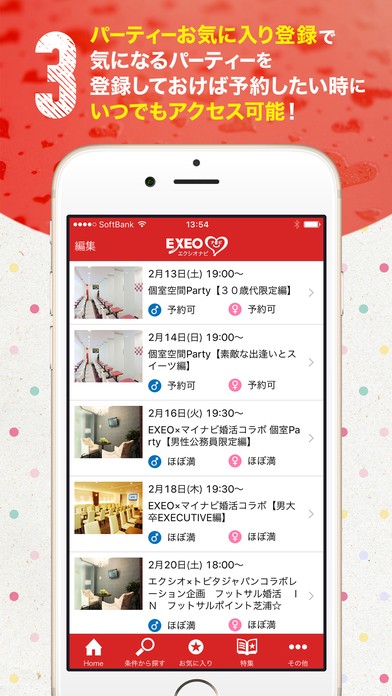 「エクシオナビ - 婚活パーティー お見合いパーティー」は、日付や条件、企画からお見合いパーティーの検索可能!
