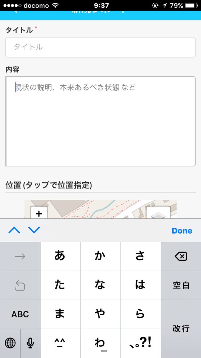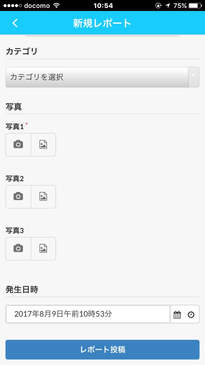 すると新規レポートと表示された画面に変わり、タイトル、内容、現在地取得、カテゴリ、写真、発生日時の記入欄があるので記入します。