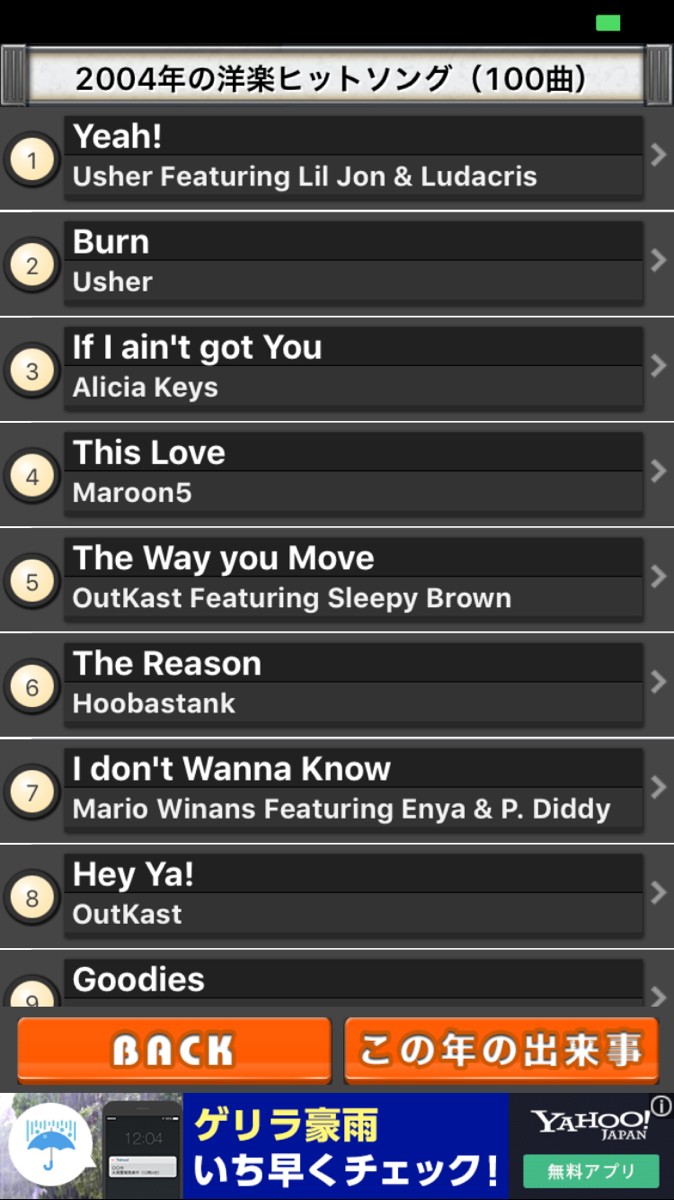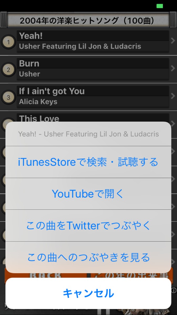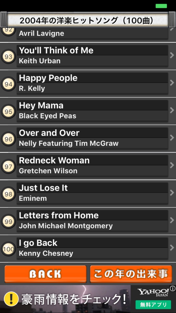 ・選択した年の洋楽ヒットソングのランキングが、100位まで表示されます。