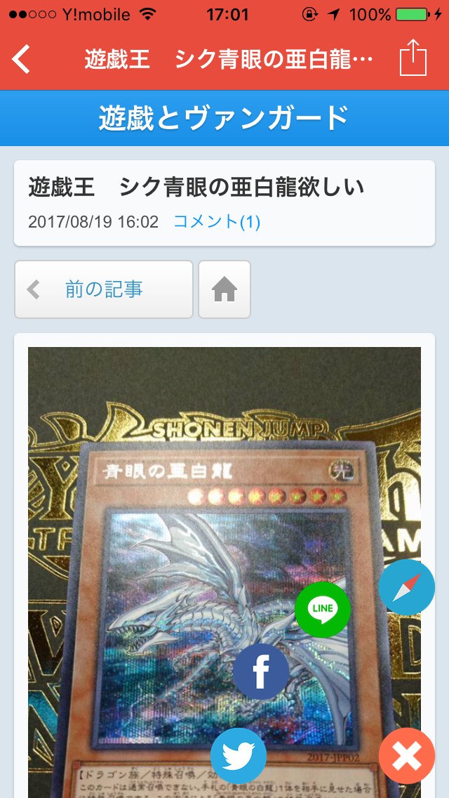 記事を開いた後画面右下の+マークのアイコンをタップすることで各種SNSのアイコンが表示されるので、そこからSNSに記事の共有ができます。