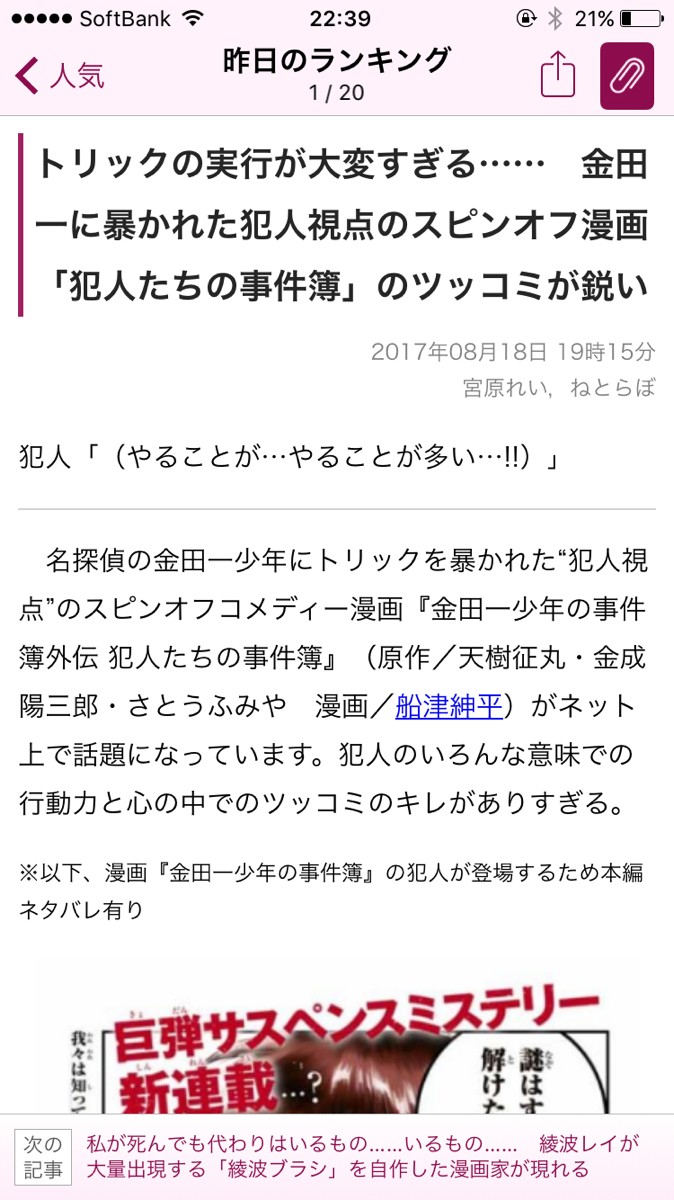 2.トップ画面は「人気」のニュースが表示されます。1位から3位のランキングが表示される他、人気の記事が10点掲載されています。その他、昨日のランキングや、先週のランキングも表示されるので、サクッとチェックしたい場合はこのページを見てみると良いでしょう。