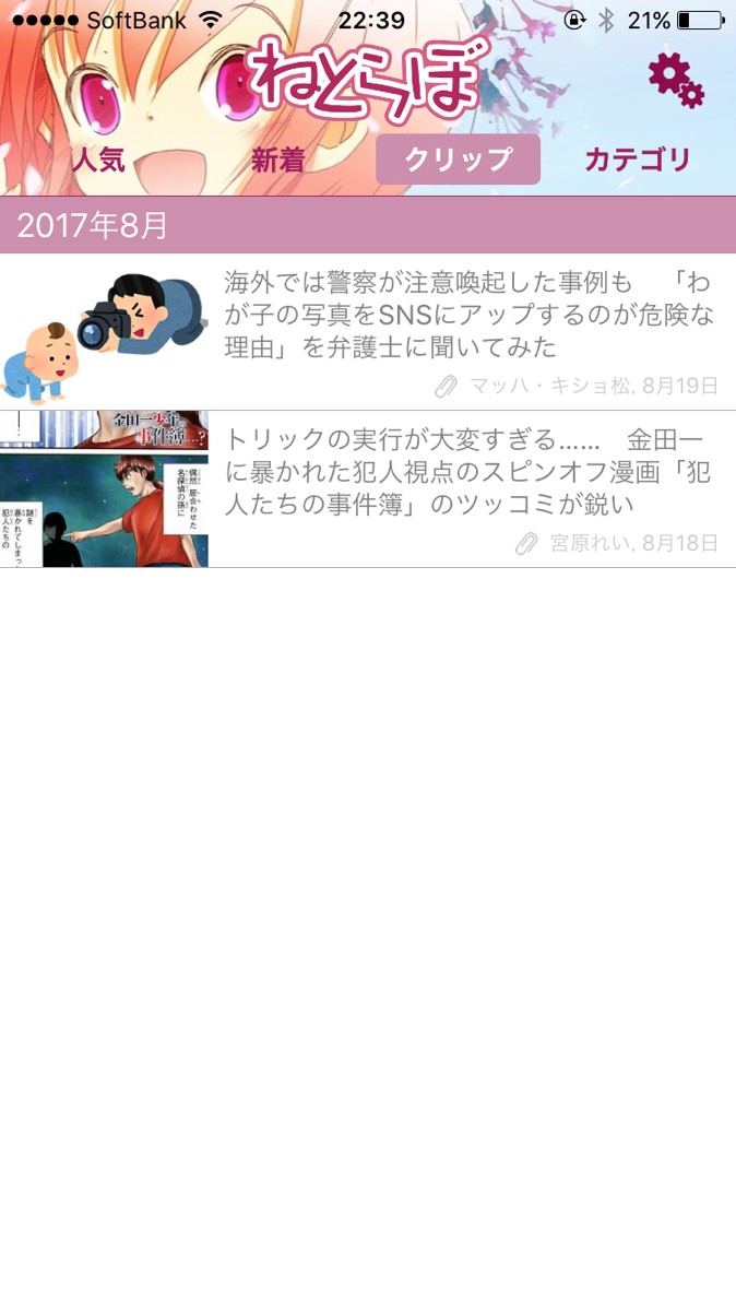 4.「クリップ」は、保存した記事を見られます。保存期間等も特にないので、いつでも見返せるのが嬉しいですね。