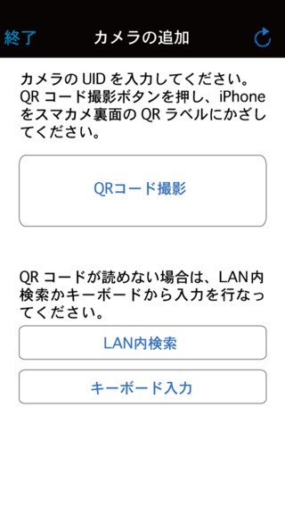 - 「PLANEX スマカメ」を起動させて、「スマカメ」の背面にあるQRコードを読み取り、パスワードを入力