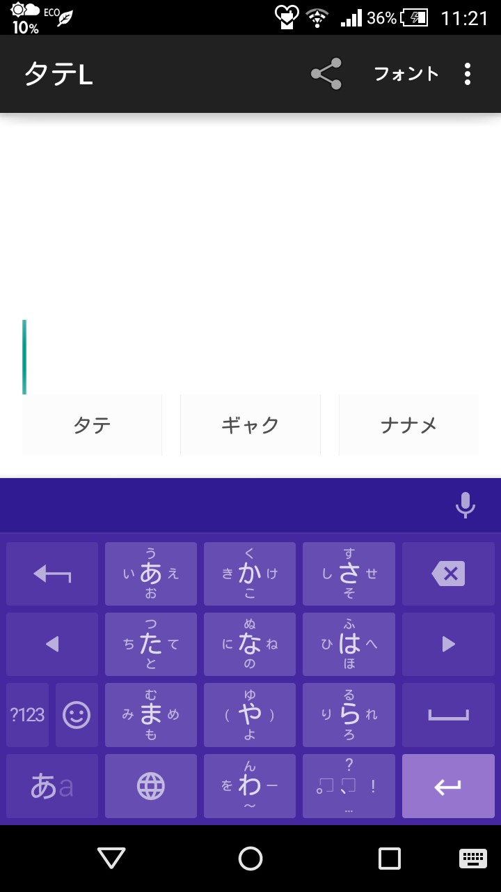 この「タテL」の使い方はとても簡単。アプリを立ち上げるとテキストの入力画面になるので、そこへ送りたいメッセージを入力します。そして、そのメッセージを「タテ」「ギャク」「ナナメ」に加工して送信することができるというわけです。