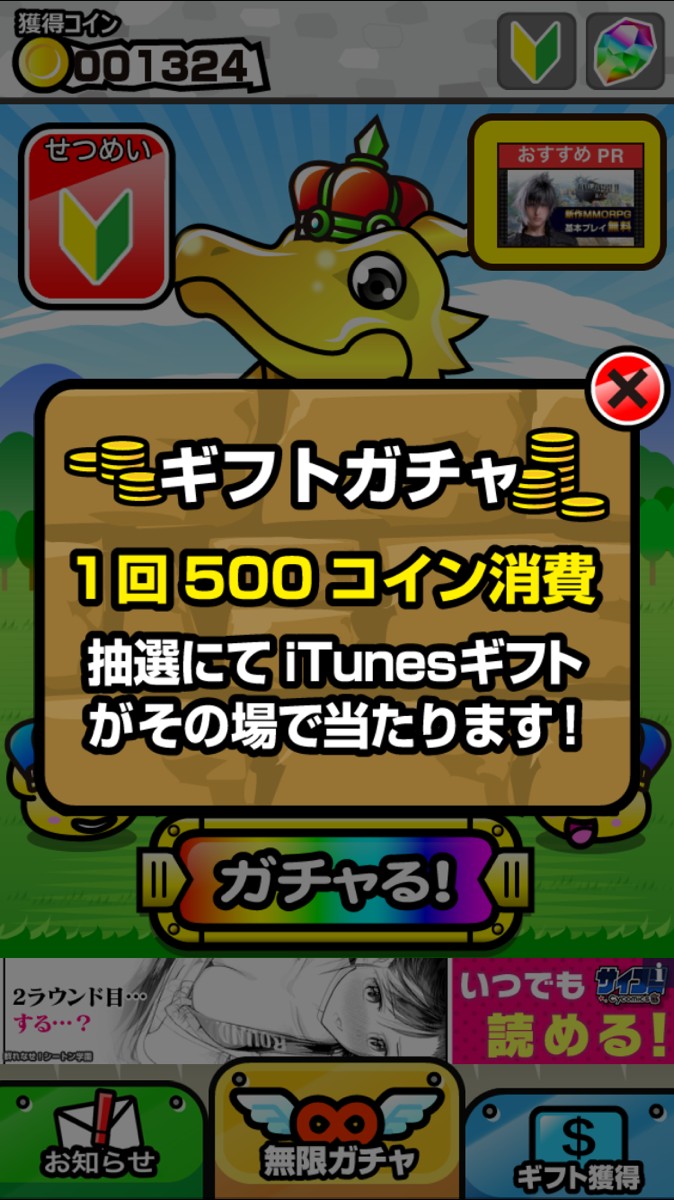 ポイントが貯まると、ギフト券が獲得できるガチャに挑戦できます。1度ガチャを回すのに500ポイントを消費ます。