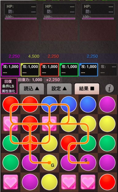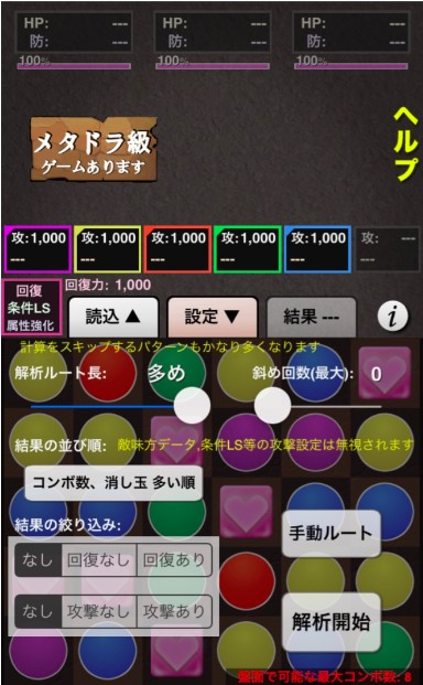 味方の攻撃力やスキル、敵についてのデーターなどを入力することで、より効果的なルートを検出することも可能で、攻撃スコアの多いルートがいいのか、コンボ数の多いルートがいいのかといった、解析結果の表示順まで、そのときの状況に合わせて設定することができてしまいます。