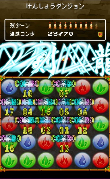 けんしょうダンジョンへはスタミナを消費して挑みます。10ターン以内に指定されたコンボ数を達成すればクリア。難易度は中級・上級・超級と分かれており、練習ダンジョンで経験値を貯めてレベルアップすると、スタミナの上限が増えてより難しい難易度に挑戦できるようになります。練習ダンジョンでのスタミナ消費はないので、パズルの練習がてら繰り返しプレイしてみてくださいね。