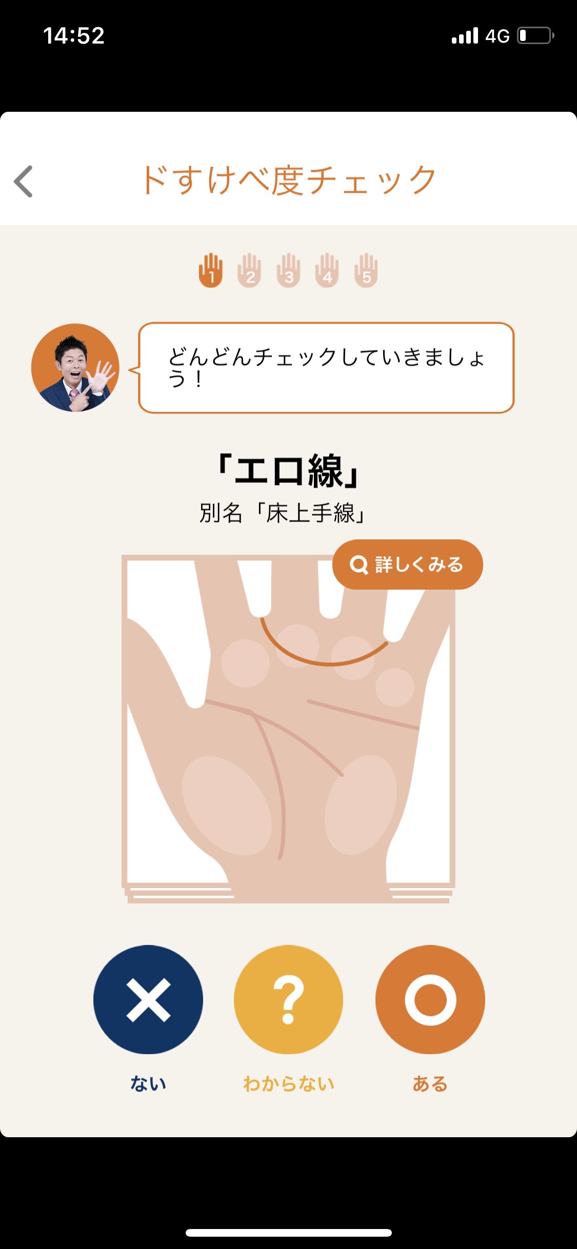 5つの手相の有無で、様々な「○○度」を診断できます。全10種類のうち、「ドすけべ度」「おもしろ芸人度」「理想の上司度」の3つは無料で利用可能です。