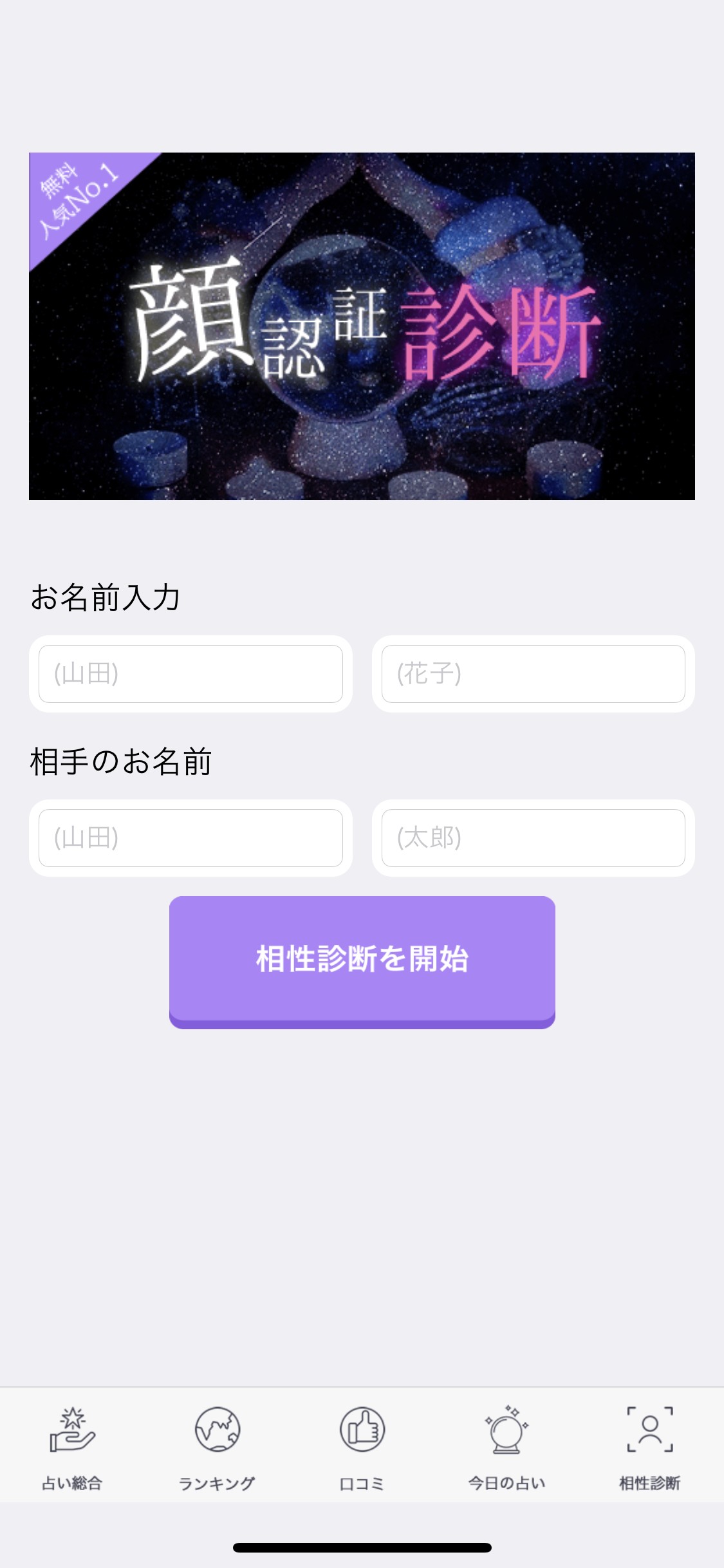 - 占いたい2人の名前を入力し「相性診断を開始」をタップ。指示に従い、2人の顔写真を撮影する。