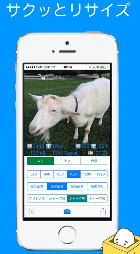 画像のリサイズと圧縮に特化したアプリです。データ容量を小さくする圧縮とリサイズを同時にできるので、メール添付にも役立ちます。