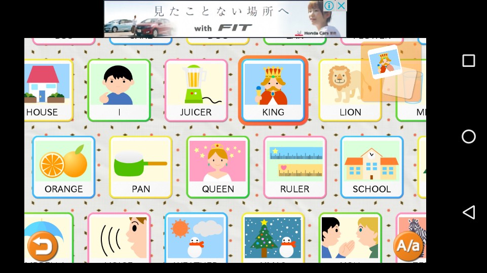 ○「ABC World」…アルファベットモードです。大文字と小文字が一緒に書かれてあるアルファベットのカードが並んでいますので、好きなカードを選んでみましょう。ネイティブの発音で聞くことができます。