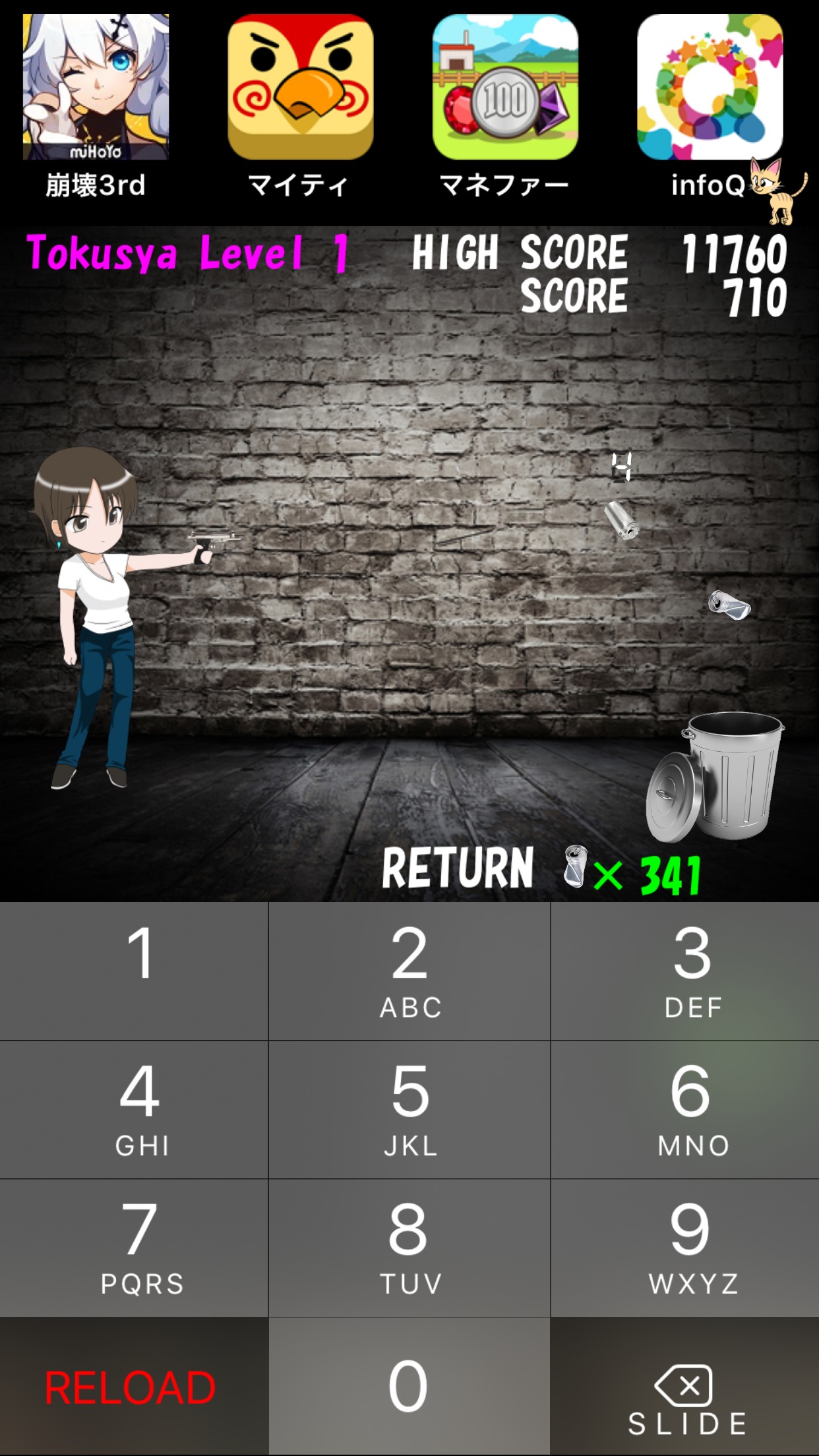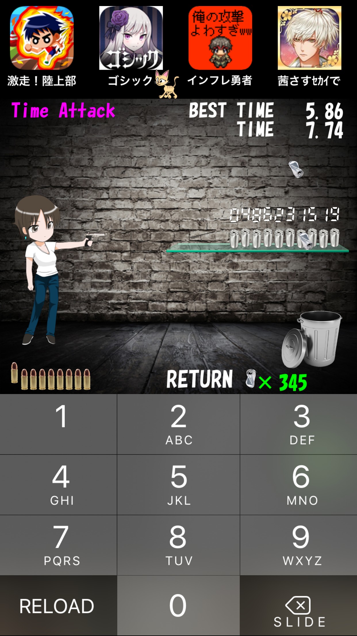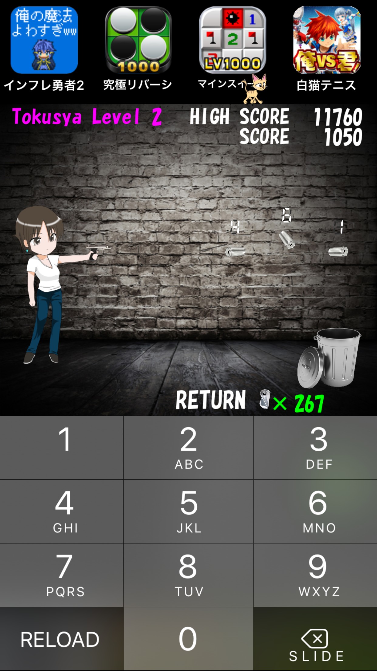 連続して飛んでくる空き缶をナンバーパッドをタップしながら打ち抜きます。