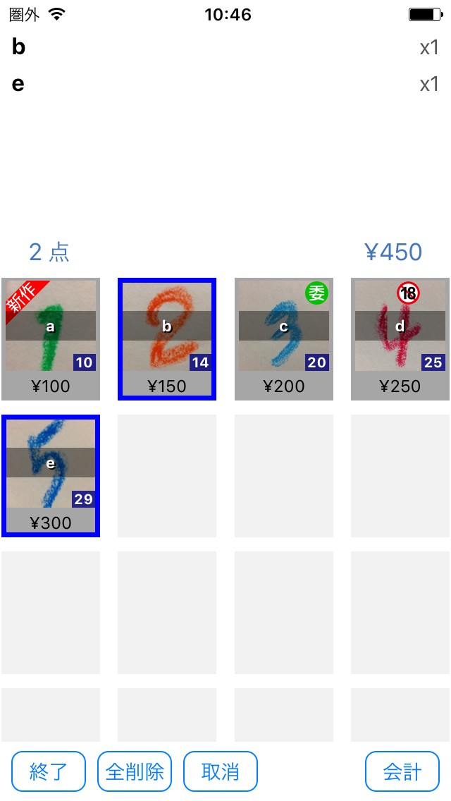 左上の登録を押すと最初の画面に戻り、グレーのマス目に商品が登録されている状態になります。