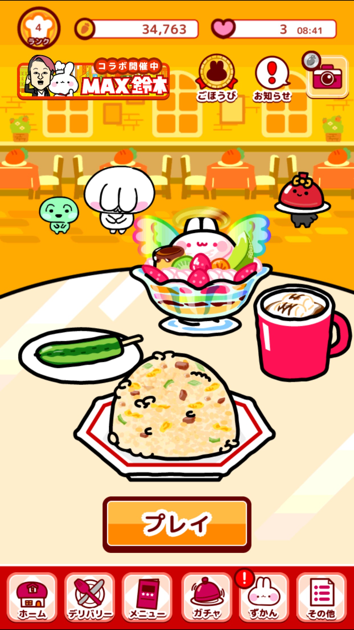 レストランのシェフ「デリうさぎ」といっしょにレストランを訪れるお客さまに、お食事をおだししましょう。お客さまはお腹ペコペコで待ちきれない様子。60秒の制限時間のうちに、できるだけたくさんのお食事をおだしして、お客さまに満足していただきましょう。