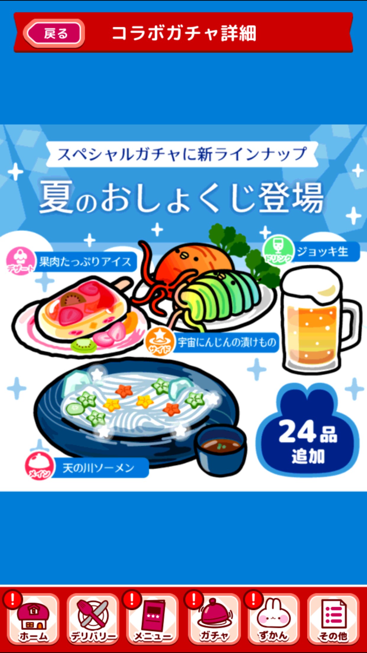 うりあげがたまったらガチャを回して、新しいお食事をゲット!お食事の種類は、レギュラーメニューやコラボ期間のスペシャルメニューなど150種類以上も。お食事のバリエーションも、お寿司やピザ、天丼、たまご焼きなど豊富です。デザートには、ソフトクリームやパフェ、たいやきなども。