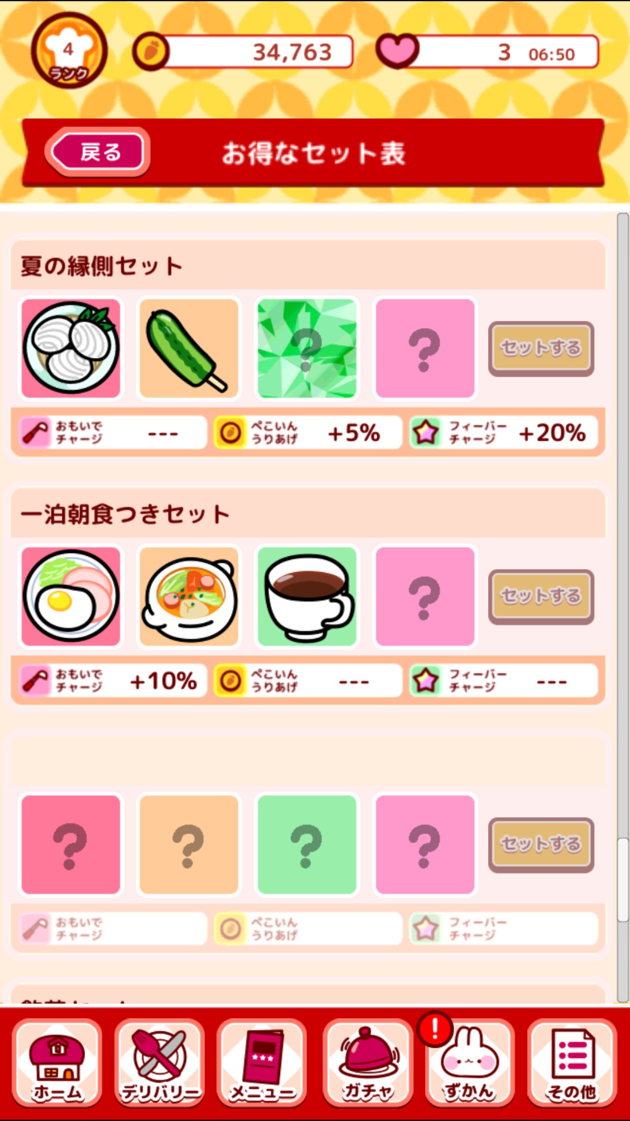 セットメニューには、あらかじめ4種類が1つずつ用意されています。まずは用意されたセットメニューをおだしして、うりあげをためていきましょう。