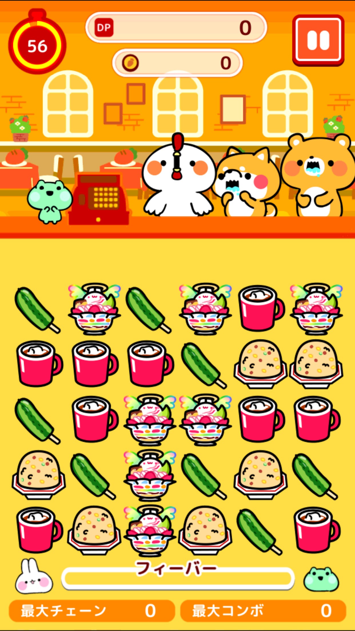 ルールはとてもシンプルで、同じパネルを3つ以上並べて、お客さまに食事をおだします。お客さまが食べれば食べるほど、「DPスコア(おきゃくさまの満足)」「うりあげ」「お食事LV」の3つがたまっていき、レベルもアップします。