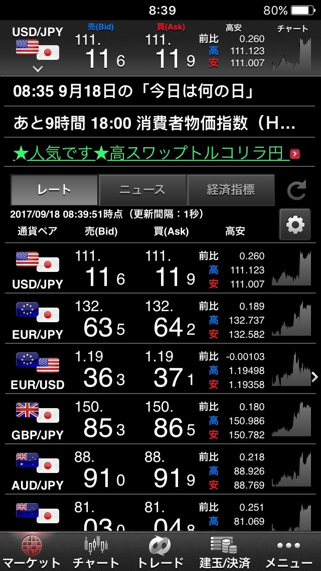 先ず、アプリを起動しますと、MENUの[マーケット][チャート][トレード][建玉/決済]