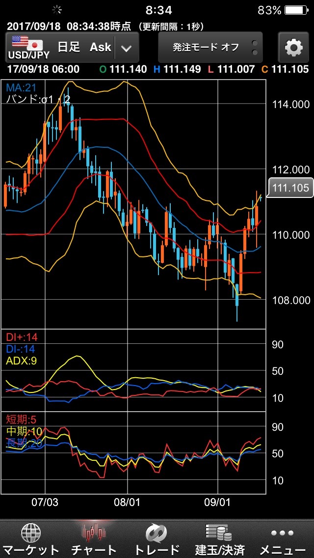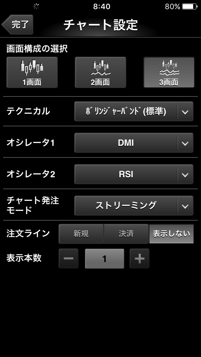 MENU[チャート]は、テクニカル系(メイン)が1面、オシレータ系がMAX2面の計3面構成のチャート