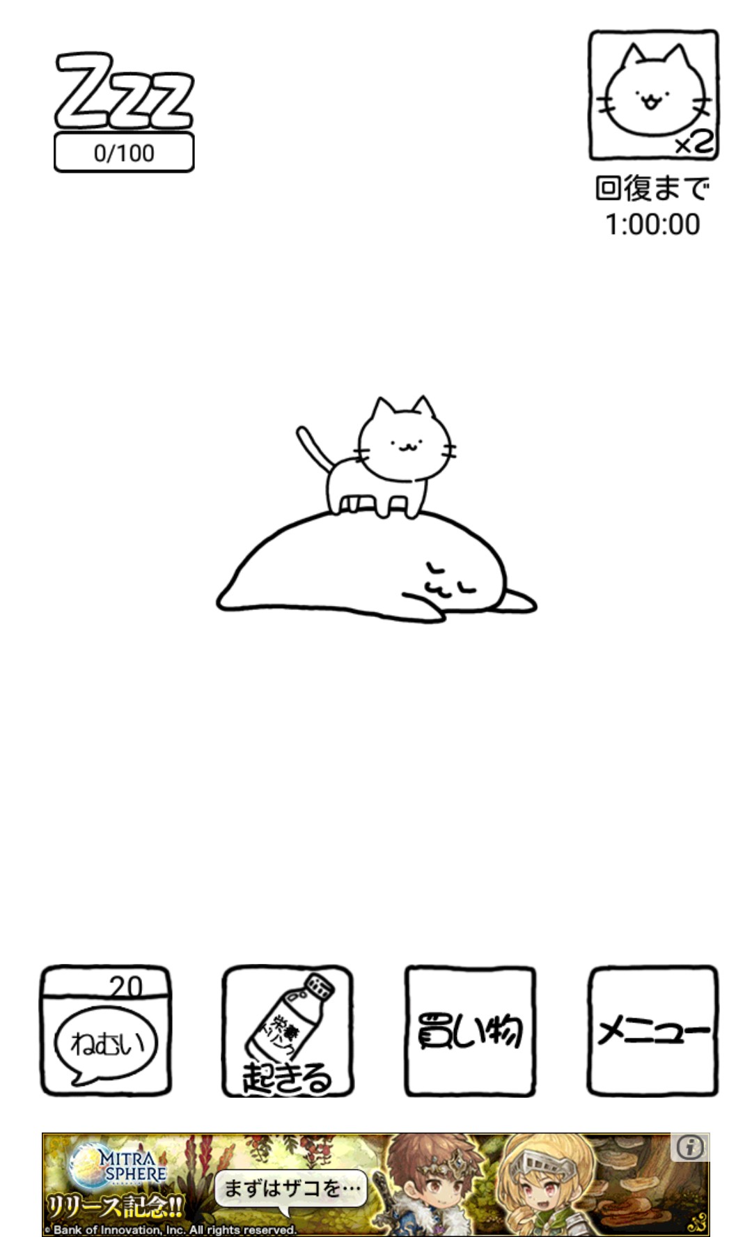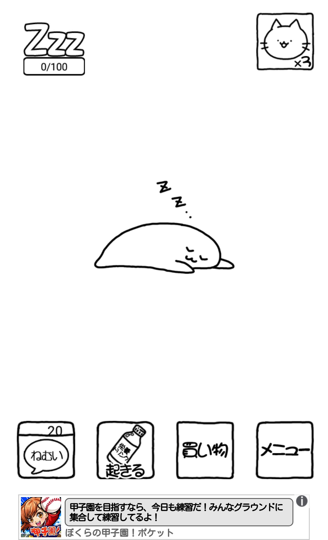 この何とも言えないかわいいねこちゃんがねるたろうに癒やしを運んで来てくれて「ZZZ」を30ポイントプラスしてくれます。