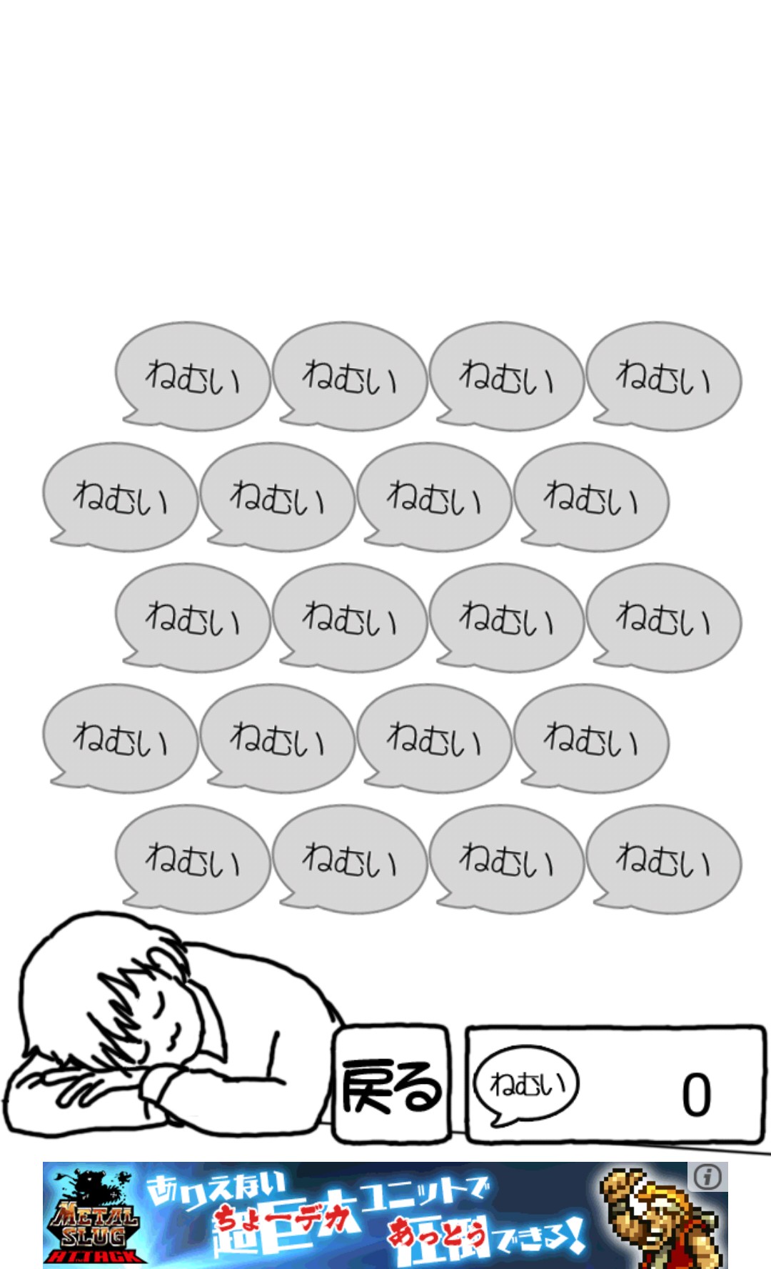 栄養ドリンクマークの「起きる」をタップすると人が眠っている画面にチェンジします。そこには「ねむい」がたっぷり。