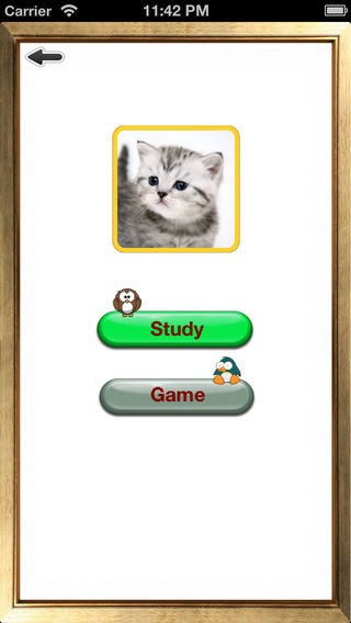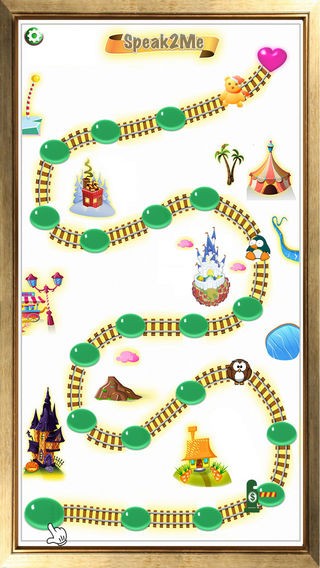 「英単語カード – 楽しく初めての英語発音」の遊ぶ手順ですが、初めのアプリ立ち上げの画面から。線路のくねくねと曲がりくねった可愛らしいイラストが表示されます。このマップからステージを選んでいき、ジャンル毎(動物・果物など)に仕切られた中の「英単語」を勉強していきます。最初「スタディ」と「ゲーム」という選択ボタンがありますので、セレクトしてください。「スタディ」はゲームの前にまずは読みとか発音とかスペルを学ぶことが出来ます。ネイティブの発音に合わせて自分の声が録音できるので違いが簡単に分かり、真似をしながら正しい発音を身につけることが出来ます。