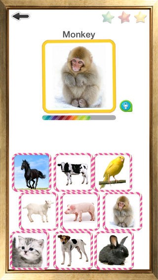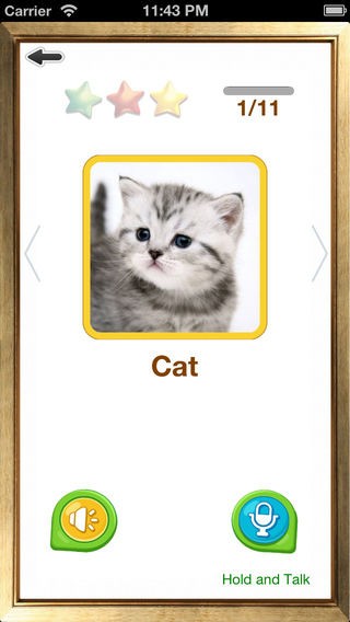 それがある程度学べたと思ったら、次ぎは「ゲーム」を選択していきましょう。多くのジャンルごとに分けられた「英単語」が学べます。例:動物ならば、カワイイ写真が画面の下に登場してきます。そこで、カードの絵柄に対すてなんという動物か種類を英語で吹き込みます。ここでマイクのイラスト「話す」ボタンを押したままで単語を話すと、それを聞き取って、発話解析エンジンで自動的に発音を採点する(ネイティブ英語発音との違いをチェック)という機能があります。※ 発話解析精度向上のため:静かな場所で少し大きな声ではっきり発音してください。正確な発音と認められれば、その「動物の写真」が消えます。