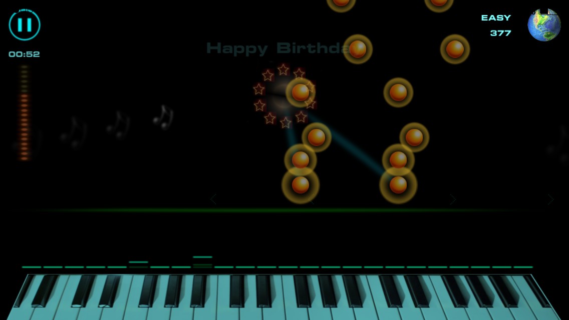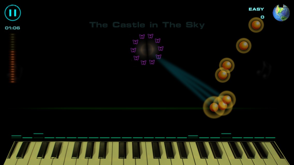 「黄色い玉」が画面の上から落ちてきて、画面の下の方の「緑の線」に達したタイミングで鍵盤をタップすることで、音が鳴り、タップのタイミングが合っているほど、得点が高くなるという、ゲームになります。