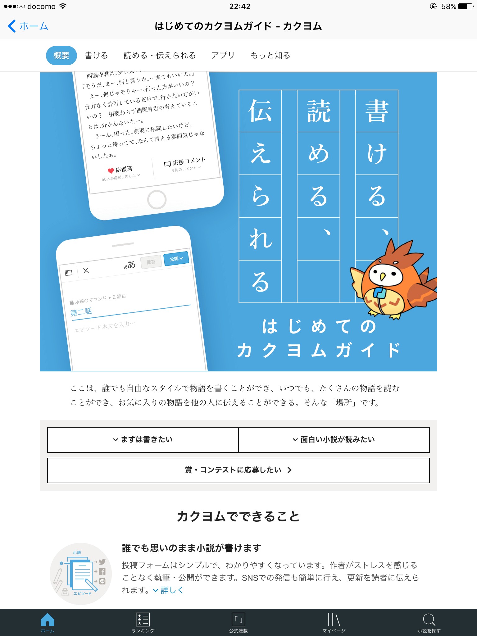 小説家を目指す方は、定期的に新人賞を開催する有名出版社に応募するのが一般的。しかし、もっと気軽に挑戦できる方法があります。小説の投稿サイトを利用してみましょう。大手出版社のカドカワがインターネット事業に乗り出し、開発した「カクヨム」。ここで投稿して見事目に留まると、書籍化への近道になるかもしれません。アプリ版では、書く機能はありませんが、アプリからサイトを開けます。コンテスト優勝者には、書籍化と賞金もあり、各方面から小説家を目指す人で人気です。アプリではさまざまなジャンルの小説を縦スクロールの簡単操作で、通信制限のある方も気長に読み込めます。