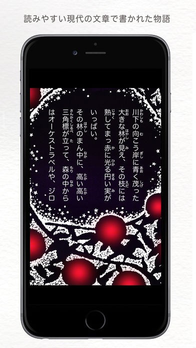絵本と音楽で宮沢賢治の文学作品が楽しめるアプリです。お子さんのいる家庭や、知的で美しい絵を鑑賞しながら音楽に合わせて文学の世界に浸りたい方におすすめします。知的な宮沢賢治の文章を現代調に編集。44枚の美しい絵に合わせてよりわかりやすく古典文学を親しめる内容です。バックグランドに流れる音楽をオンにすると、15曲のトイトロニカなリズムが心地よく流れます。また、回転して飛び出す星座盤のおまけもあって大勢でも楽しめる文学アプリです。